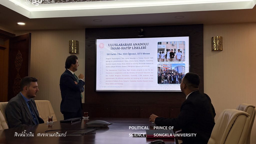 ศูนย์ศึกษาตุรกี คณะรัฐศาสตร์ มหาวิทยาลัยสงขลานครินทร์ ร่วมกับสมาคมเครือข่ายสถาบันปอเนาะ และตัวแทนจากสถาบันศาสนาและองค์กรภาคส่วนต่าง ๆ ในพื้นที่จังหวัดชายแดนภาคใต้ ได้เข้าร่วมโครงการศึกษาดูงานและอบรมพัฒนาศักยภาพ ณ หน่วยงานภายใต้สำนักกิจการศาสนาแห่งสาธารณรัฐตุรกีระหว่างวันที่ 2–9 พฤศจิกายน 2568 ณ กรุงอังการา และนครอิสตันบูล สาธารณรัฐตุรกี โครงการดังกล่าวมีวัตถุประสงค์เพื่อส่งเสริมองค์ความรู้และแลกเปลี่ยนประสบการณ์ด้านการบริหารจัดการองค์กรศาสนา บทบาทของศาสนาในการพัฒนาสังคม การเสริมสร้างความเข้มแข็งของชุมชน ตลอดจนการเรียนรู้แนวปฏิบัติที่ดีจากองค์กรศาสนาระดับชาติของสาธารณรัฐตุรกี เพื่อนำมาประยุกต์ใช้ในการพัฒนางานด้านศาสนาและสังคมในบริบทของประเทศไทยต่อไป